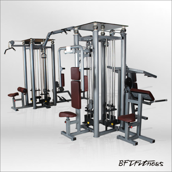 博菲特八站位综合训练器:高拉、推肩、低拉划船、二头肌、夹胸、大飞鸟龙门架、引体向上等功能,商用室内健身房器材生产厂家